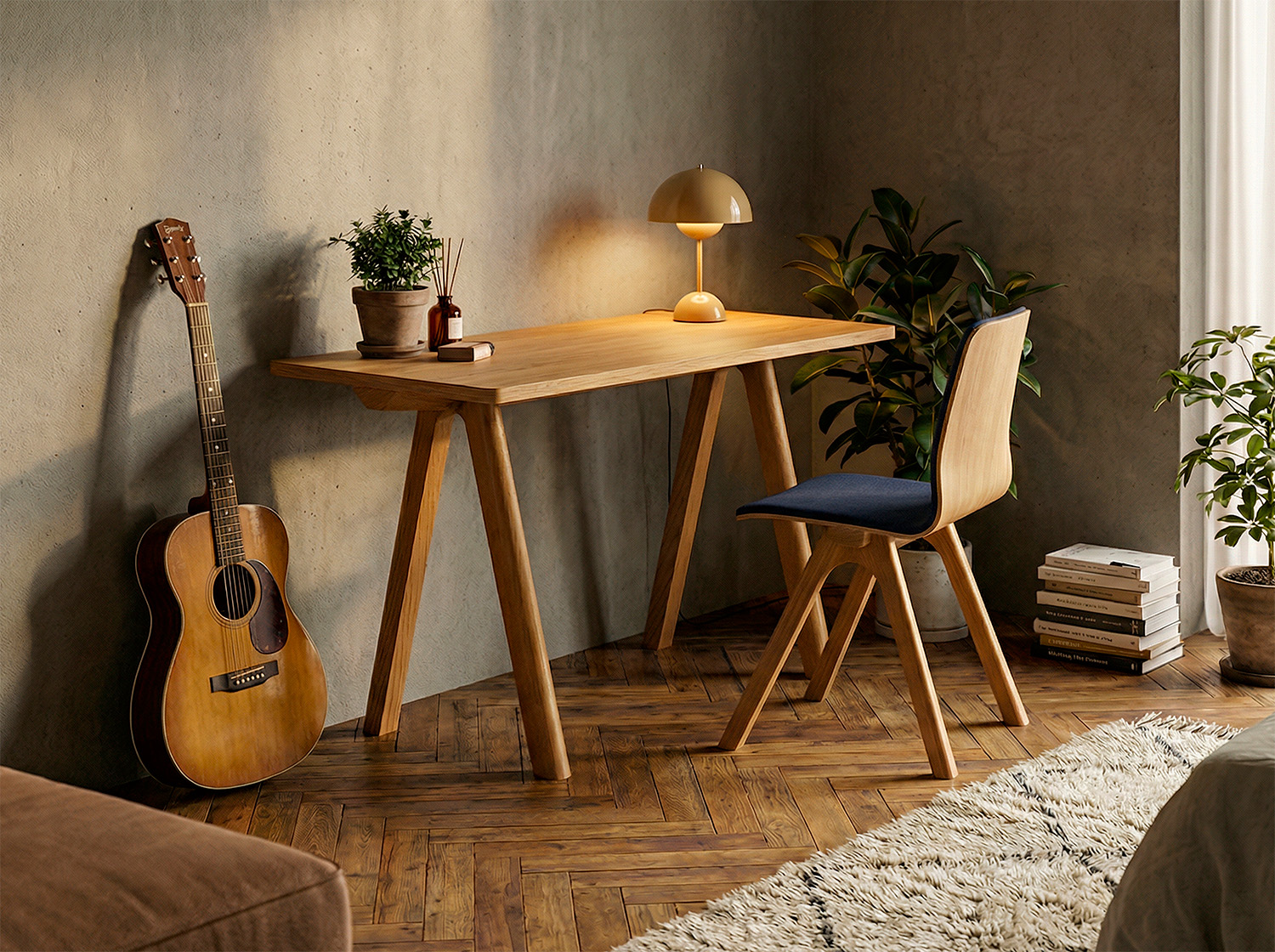 Le bureau Chevron, une création du designer Guillaume Delvigne, incarne la simplicité et l’essentiel dans son design. Inspiré par les éléments de la charpenterie, notamment les pieds évoquant des poutres, le bureau Chevron s’intègre à tout espace.