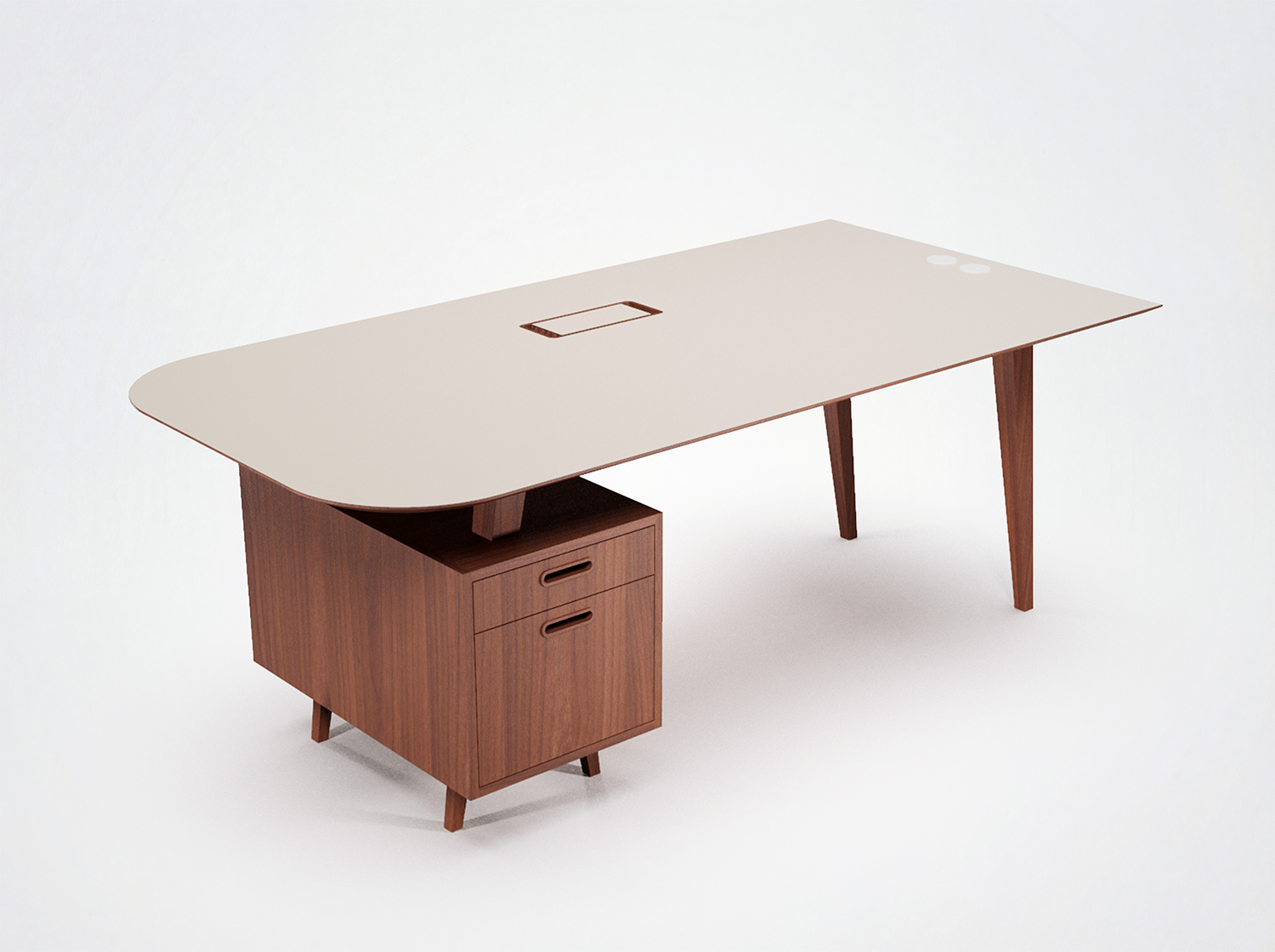 Disponible en chêne et noyer us. Structure en bois massif. Plateau bois massif, stratifié ou Fenix. Caissons et façades de tiroir en placage. Inclus : 1 goulotte en métal laqué blanc et 1 top access par poste. Disponible en option : top access supplémentaire et blocs prises