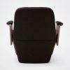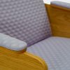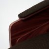 Panneaux latéraux en placage chêne ou noyer us. Partie haute de l’accoudoir recouverte de mousse et tapissée. Assise avec sangles, recouverte de mousse haute résilience, dossier recouvert de mousse. Partie basse et arrière recouvertes de mousse de 20 mm. Disponible en version sans accoudoirs.