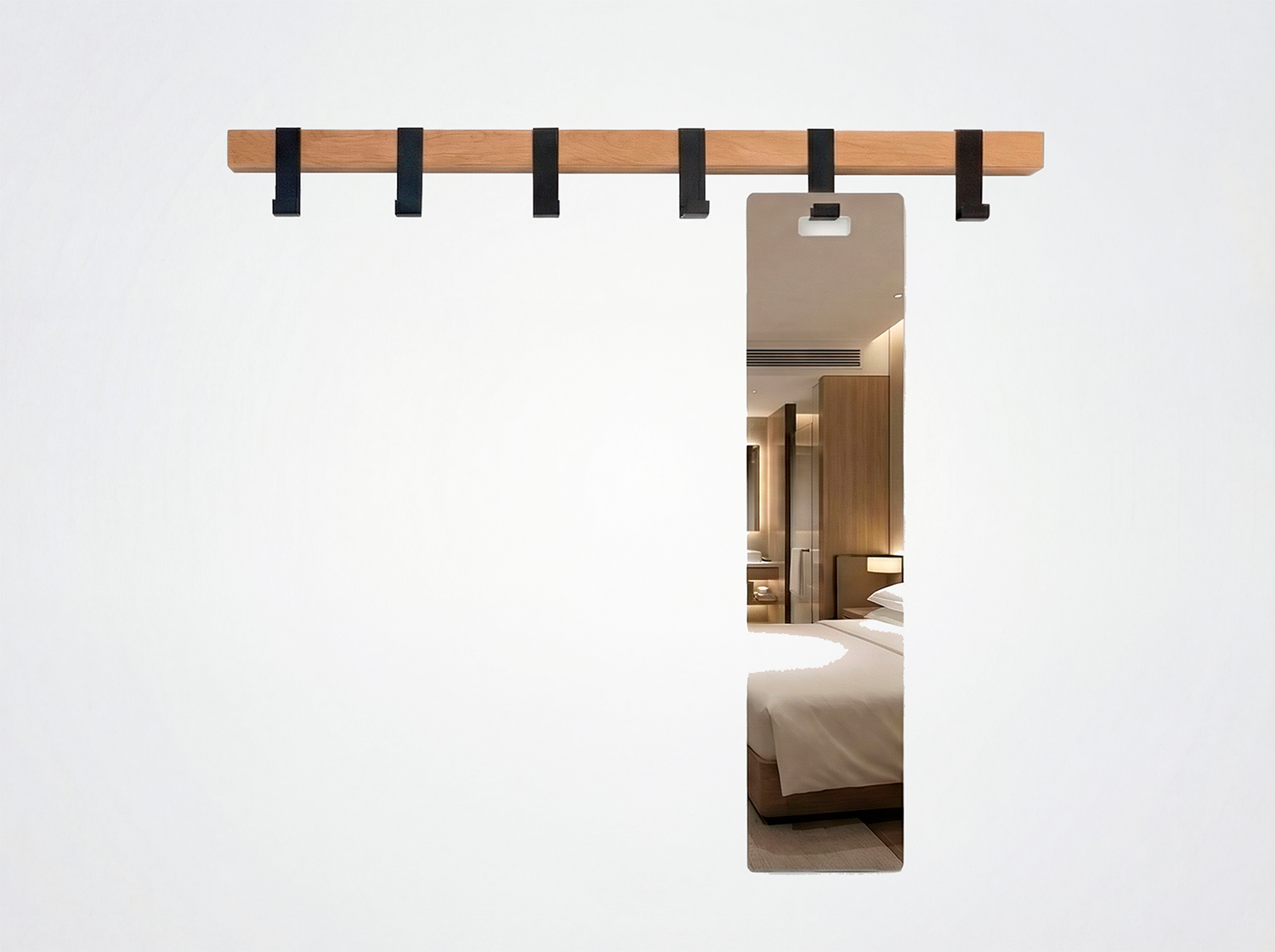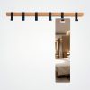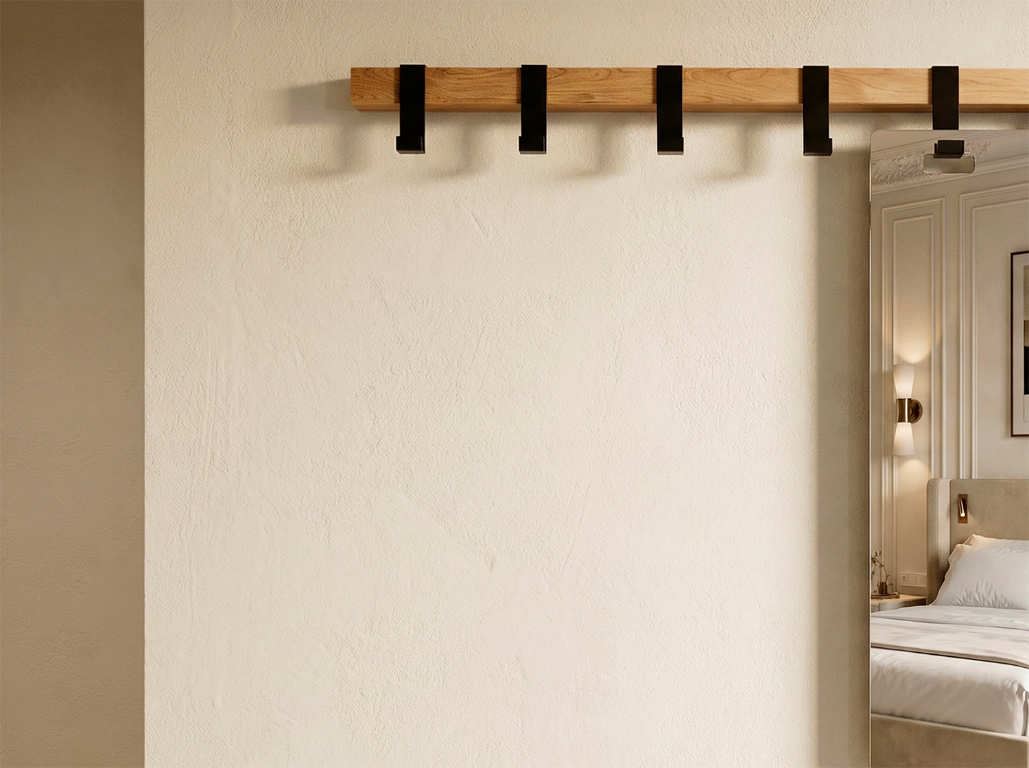 Disponible en chêne et noyer US. Traverses en bois massif. Crochet en acier disponible en noir et blanc (RAL sur demande). Crochet en inox disponible en inox, laiton ou cuivre finition brossée. Miroir collé sur panneau alésé en bois massif.