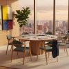 La table Volute est une pièce forte au design particulier : sa ligne a été imaginée par le designer français Pierre Dubourg qui a souhaité réinterpréter la table bistrot, grand classique de l’esprit français. Elle reprend donc le principe d’un plateau rond et d’un pied central. Ce pied porte une grande innovation technique et esthétique : il est composé d’une succession de lames de bois massif qui créent un effet cinétique en alternant les jeux d’ombre et de lumière
