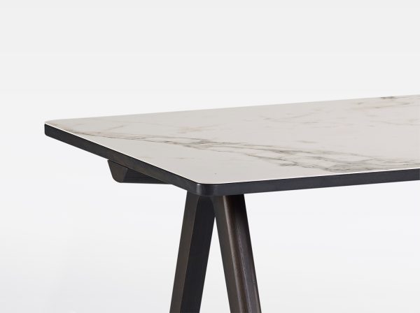 Dessus céramique : Plaque de céramique 6 mm collée sur mdf de 19 mm avec alèses en bois massif.