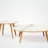 Un duo composé d’une table ronde et d’une table ovale aux pieds fuselés, offrant des possibilités infinies de combinaisons de matériaux. Vous pouvez opter pour une table entièrement en bois, une table en bois avec un plateau en céramique, ou encore deux tables entièrement en céramique, avec des dimensions variées.